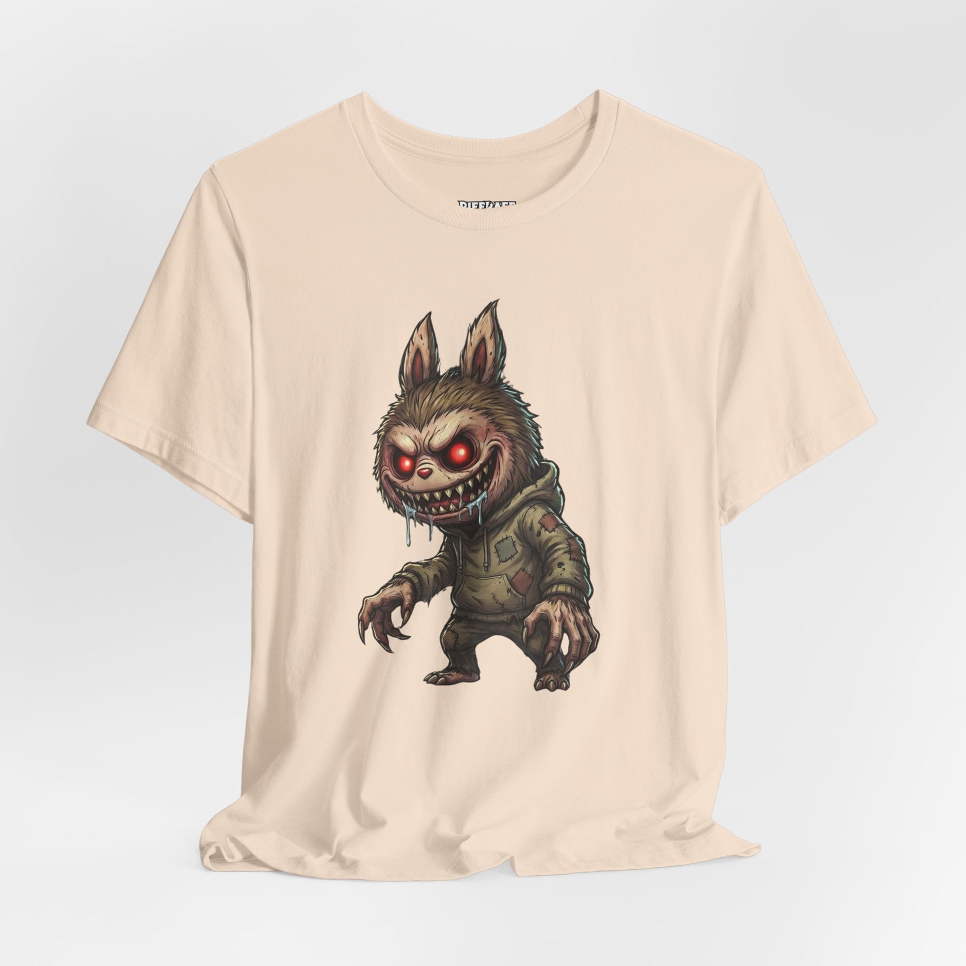 This lightweight jersey tee brings a twisted, playful edge to everyday wear. Fronted with a detailed, mischievous creature—sharp teeth, glowing eyes, and a worn hoodie—this shirt reads like a pocket-sized story from a midnight city alley. The back carries bold, unapologetic block lettering that reads as a snarky call-and-response; it lands loud without being overworked. Breathable, soft Airlume cotton keeps the fit comfortable for long days and late nights. Wear it layered under a denim jacket or alone while you wander the city, queue at shows, or kick around with friends who appreciate dark humor and bold graphics.